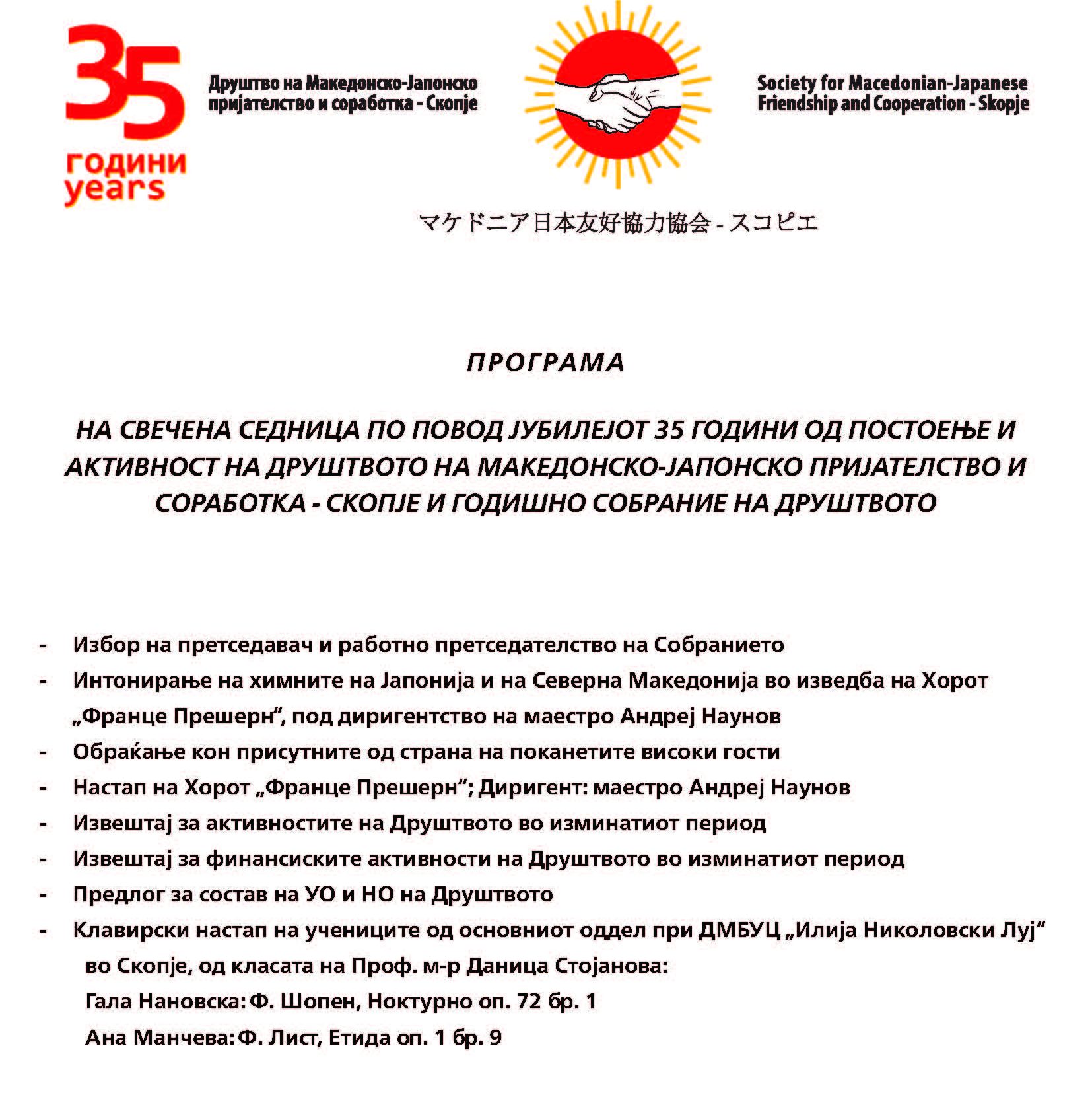 На 26 април 2025-та година со почеток во 19:00 часот во салата на Културно Информативниот Центар на град Скопје се одржа свечена седница по повод јубилејот 35 години од постоење и активност на Друштвото на македонско-јапонско пријателство и соработка – Скопје.