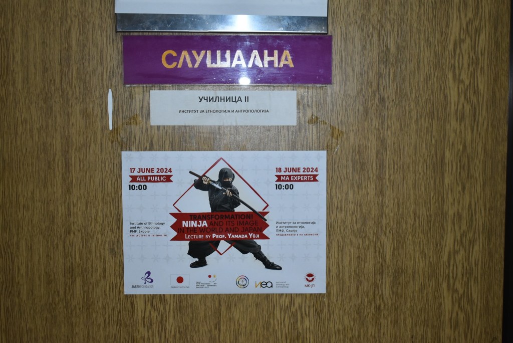 На 17 и 18 јуни 2024, во преполниот аудиториум на Институтот за етнологија и антропологија при Природно-математичкиот факултет во Скопје се одржаа две предавања на тема „Трансформација: нинџата и неговата претстава во светот и во Јапонија“ од проф. Јуџи Јамада од Универзитетот Мие, Јапонија. Тие беа поврзани со историскиот развој на нинџите, како и стереотипите поврзани со нив во западната култура.